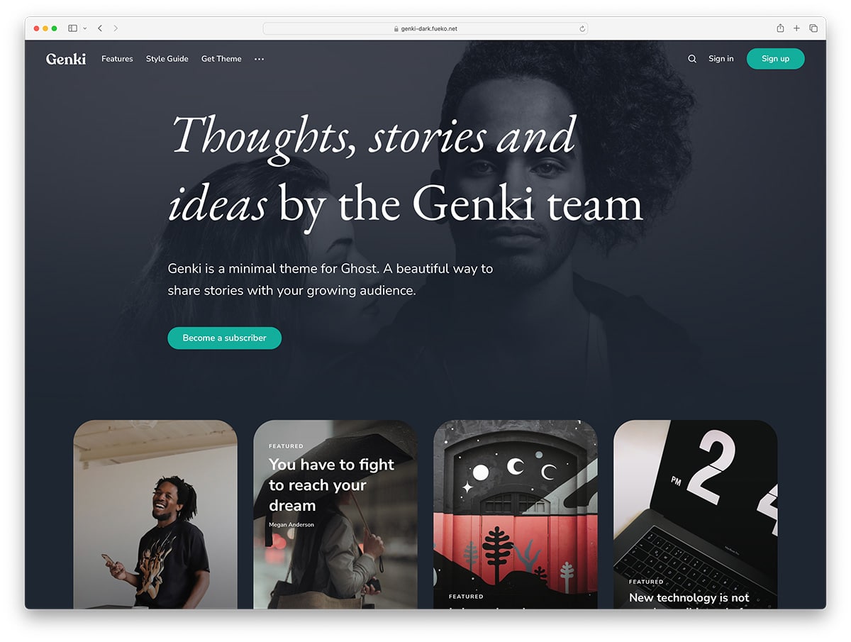 This theme has three color schemes: light, sepia, and dark, ensuring it’s fully optimized for the most recent Ghost version. Genki combines minimalism with a rich set of features, providing a clean design, quick loading times, full responsiveness, and cross-browser compatibility. It’s regularly updated and supports rapid assistance, seamlessly integrating with Ghost’s core features, such as membership levels, responsive imagery, and custom page creation.