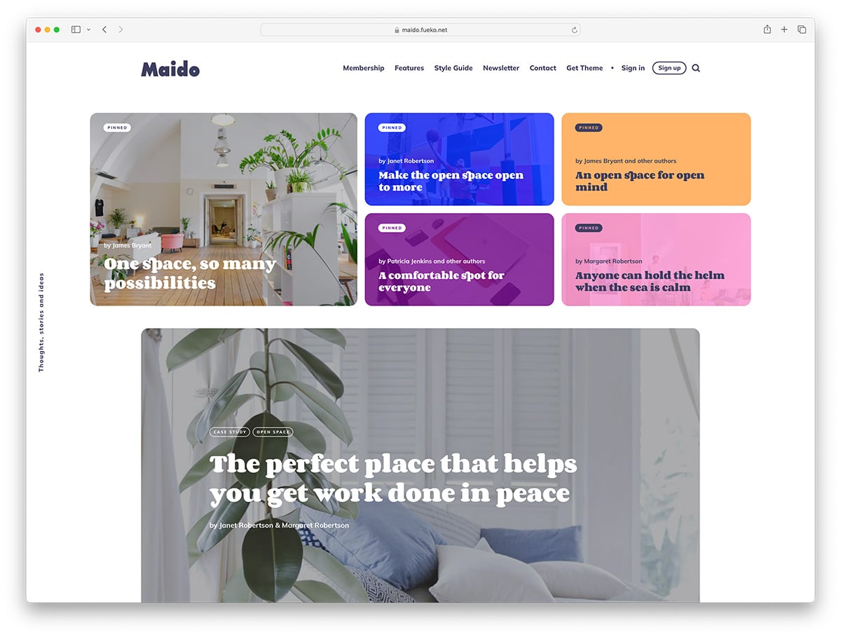Introducing Maido, a versatile and cleanly designed Ghost theme by fueko, perfect for agencies, designers, and writers seeking a blend of simplicity and functionality. With both light and dark versions available, Maido is fully responsive, ensuring a seamless experience across all devices. It’s built to be super fast, lightweight, and compatible with modern browsers, emphasizing ease of use without sacrificing design or code quality.