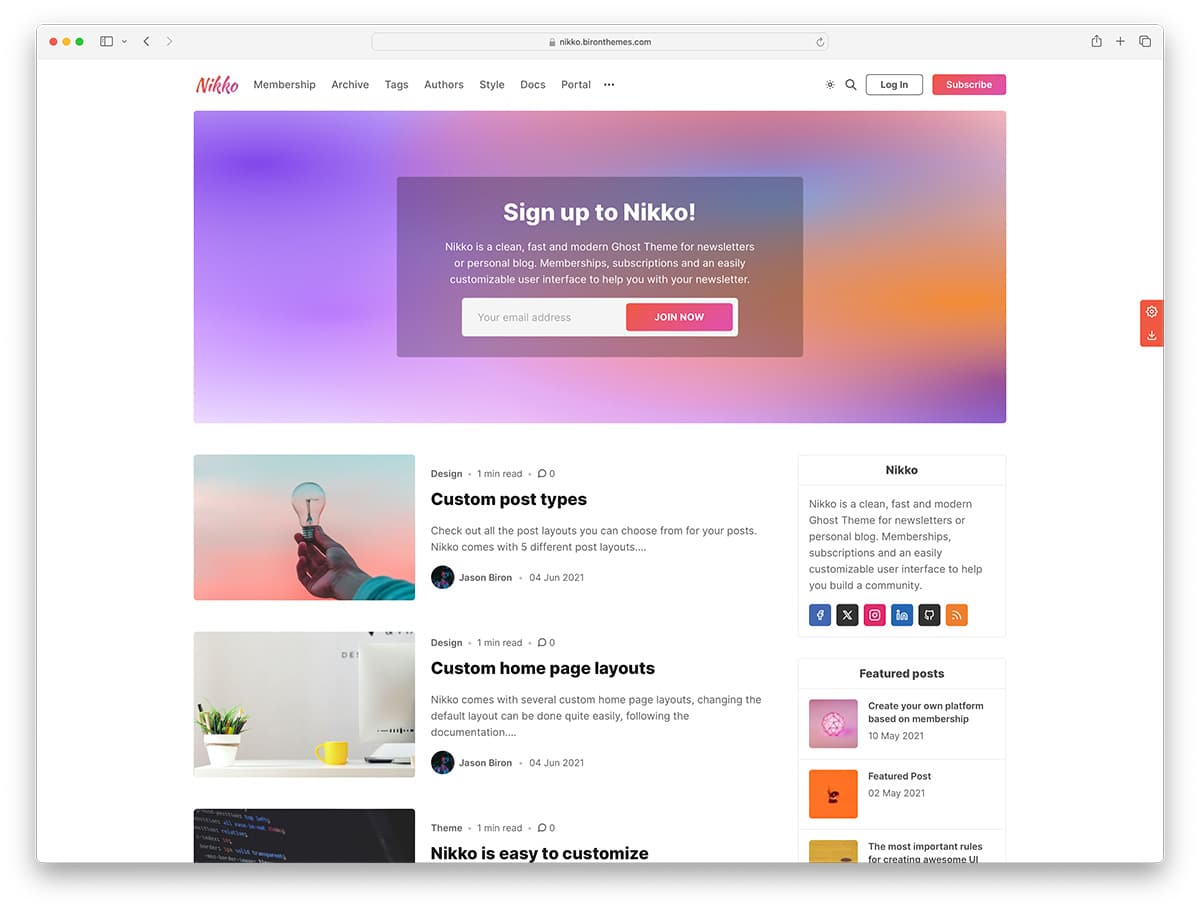 Nikko is a versatile Ghost 5 theme, perfect for creating membership sites, newsletters, or blogs. Designed as a superior alternative to Substack, it offers a seamless transition for those looking to utilize Ghost’s robust features. Nikko stands out with its exceptional performance scores, ensuring a fast and lightweight user experience. It includes four home page designs, dark and light mode options, and comprehensive support for Ghost’s membership functionalities.