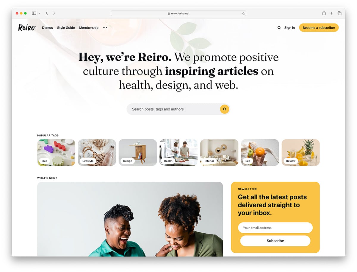 Reiro boasts a responsive design for optimal viewing on any device and is optimized for fast loading, enhancing the reader’s experience. It supports memberships and subscriptions to help grow your community and allows customization, including fonts and widgets, to make your site unique.