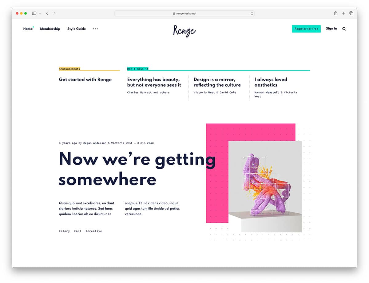 Personalization is a breeze with Renge, allowing adjustments in accent colors and post backgrounds to reflect your unique style. Fueko’s commitment to simplicity and quality is evident in Renge, making it an ideal choice for creatives looking for an online platform that stands out.