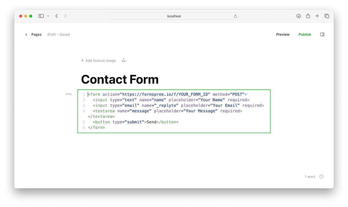 - In your Ghost post or page, insert a custom HTML card with your form code, using your Formspree URL in the action attribute: