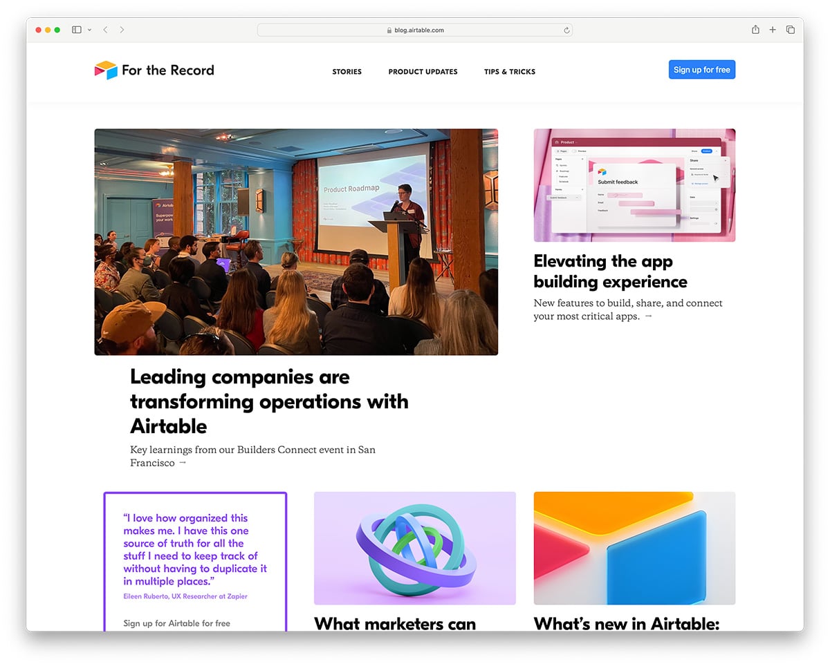 Airtable is an app-building platform used by many large businesses like The Times, BuzzFeed, Medium, Expedia, and 300,000 others. Like most other companies, Airable uses Ghost to publish news about their product offering. It features an unmistakable Ghost blog design we have seen for corporate blogs.