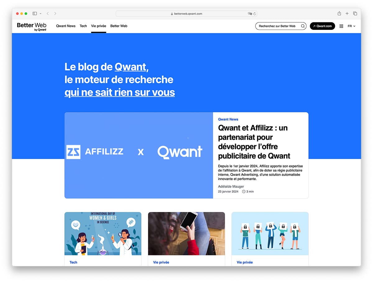 Qwant is another privacy-focused search engine that claims it is not tracking its users. Like most other brands, Qwant uses Ghost for its news blog, focusing on product announcements and education related to its industryโprivacy.