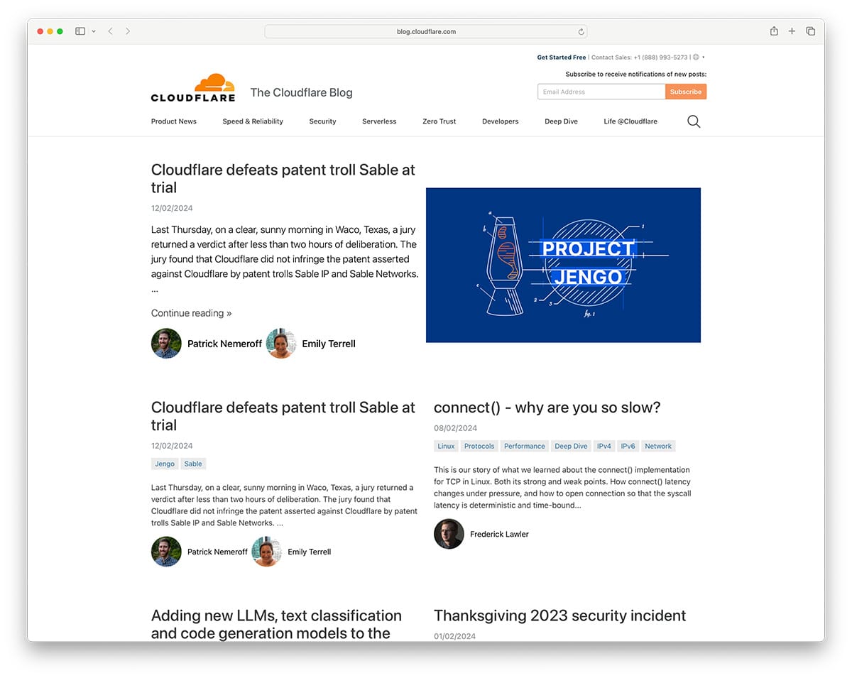 Cloudflare is one of the biggest cloud solution providers used by almost all S&P 500 companies to speed up and protect their websites and apps. Even uiCookies and all our other brands use their services. Their insider blog uses Ghost to keep customers updated on news about their services and global internet trends. The log features a completely minimalistic design, like the entire Cloudflare website.