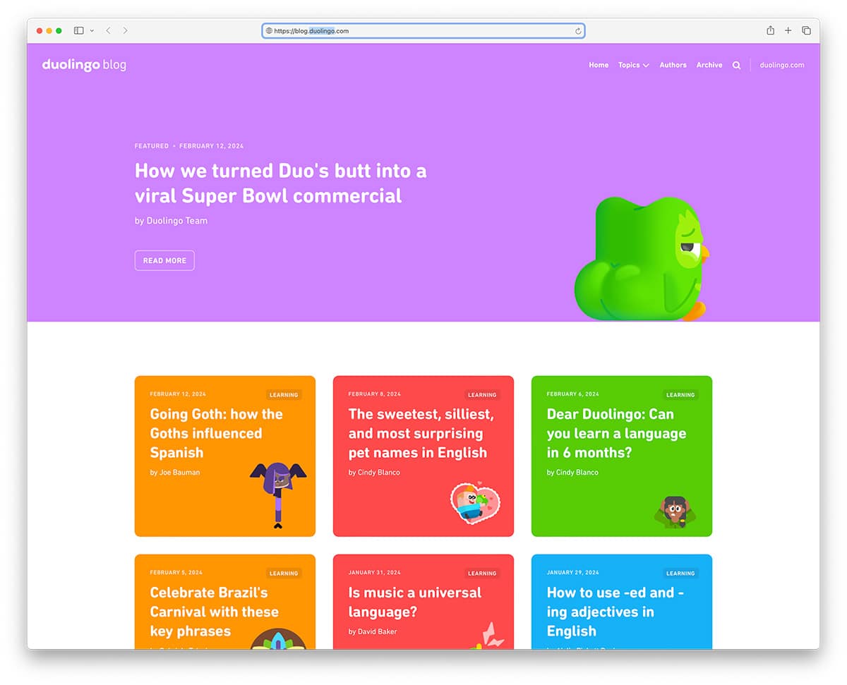 Duolingo is an app that allows you to learn any language. They use their Ghost blog to post even more educational content related to language learning. Like the app, it features bright colors that could be too much for some.