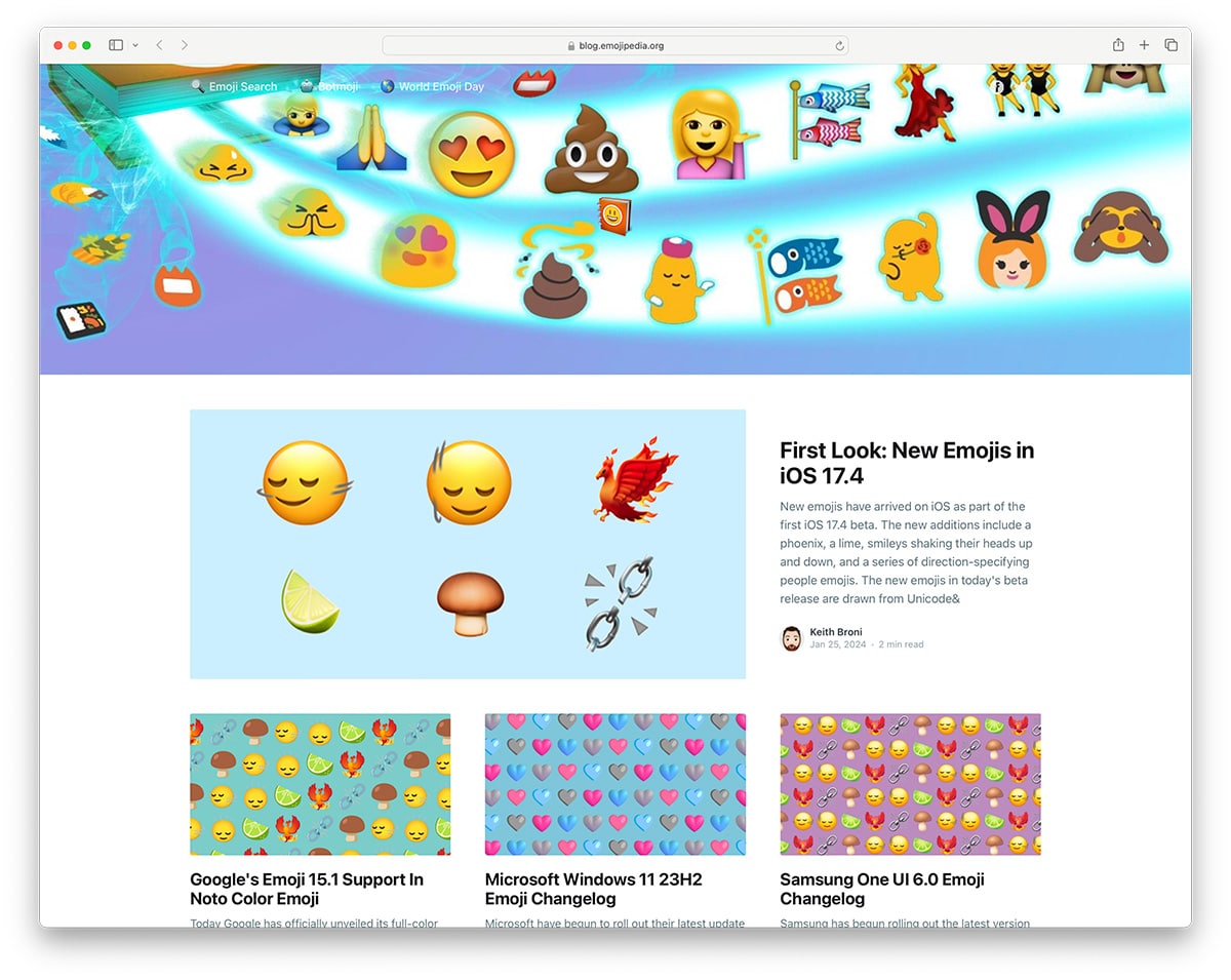 Emojipedia has the brightest and most colorful design, but I don’t blame them because they showcase everything about emojis. Their blog focuses on news in the emoji space, such as new emoji announcements and which companies are adopting and introducing new emojis.