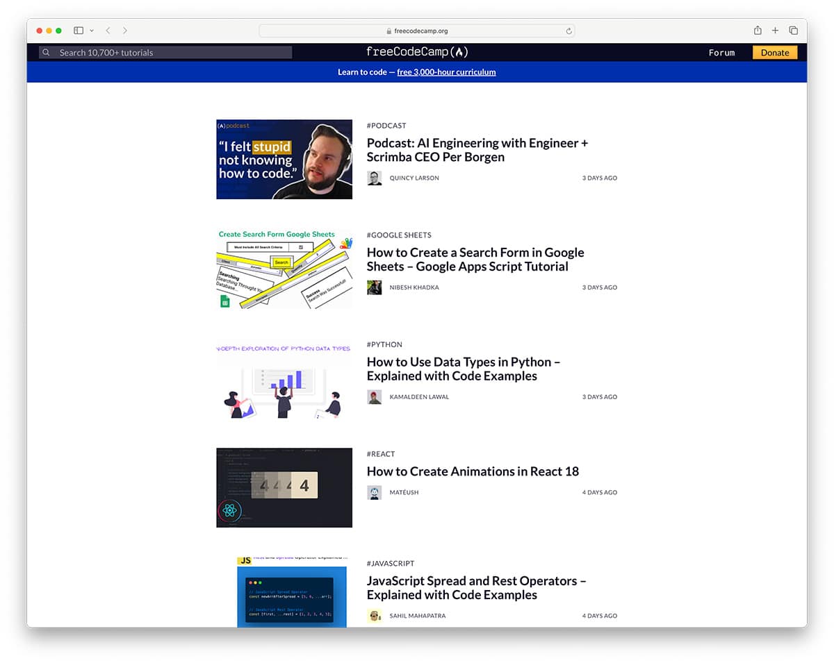 freeCodeCamp offers exactly what its name implies – free code camp. Their blog uses Ghost, which features a simple timeline style. It is one of the most well-maintained blogs based on the number of blog posts published every week. Their design leaves much to be desired, but it is a good example that no blog posts are too much for the Ghost platform.