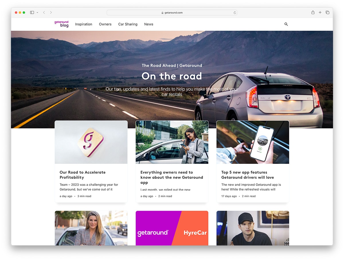 Getaround is a car rental platform with 15 years of history. They use Ghost to post educational content about renting a car on a budget, product announcements, and insights. The design focuses on automotive content with a large hero image.