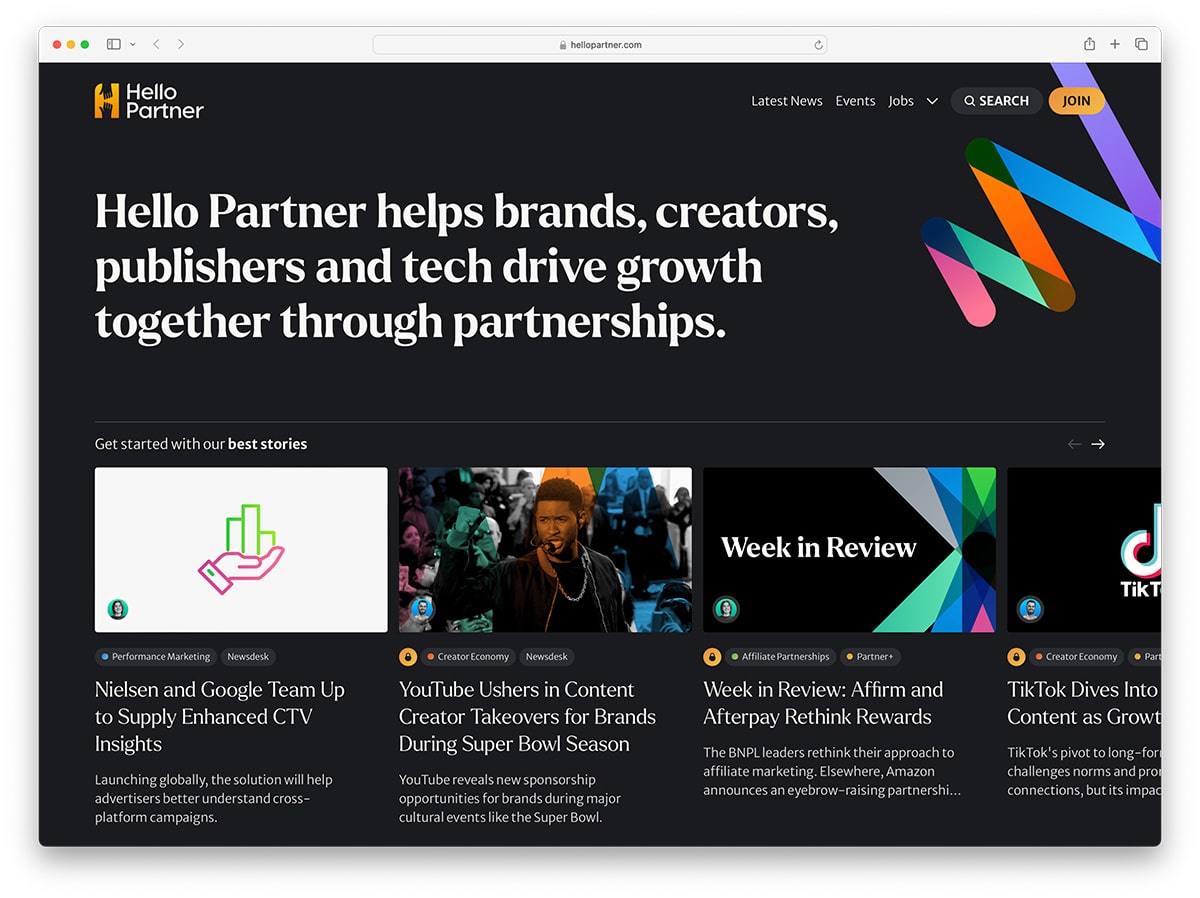 Hello, Partner is a unique concept: it is mainly a blog focused on education creators, brands, and publishers, while trying to get them to join its platform. It features a dark yet minimalist design, with a clean hero section that explains their offer.