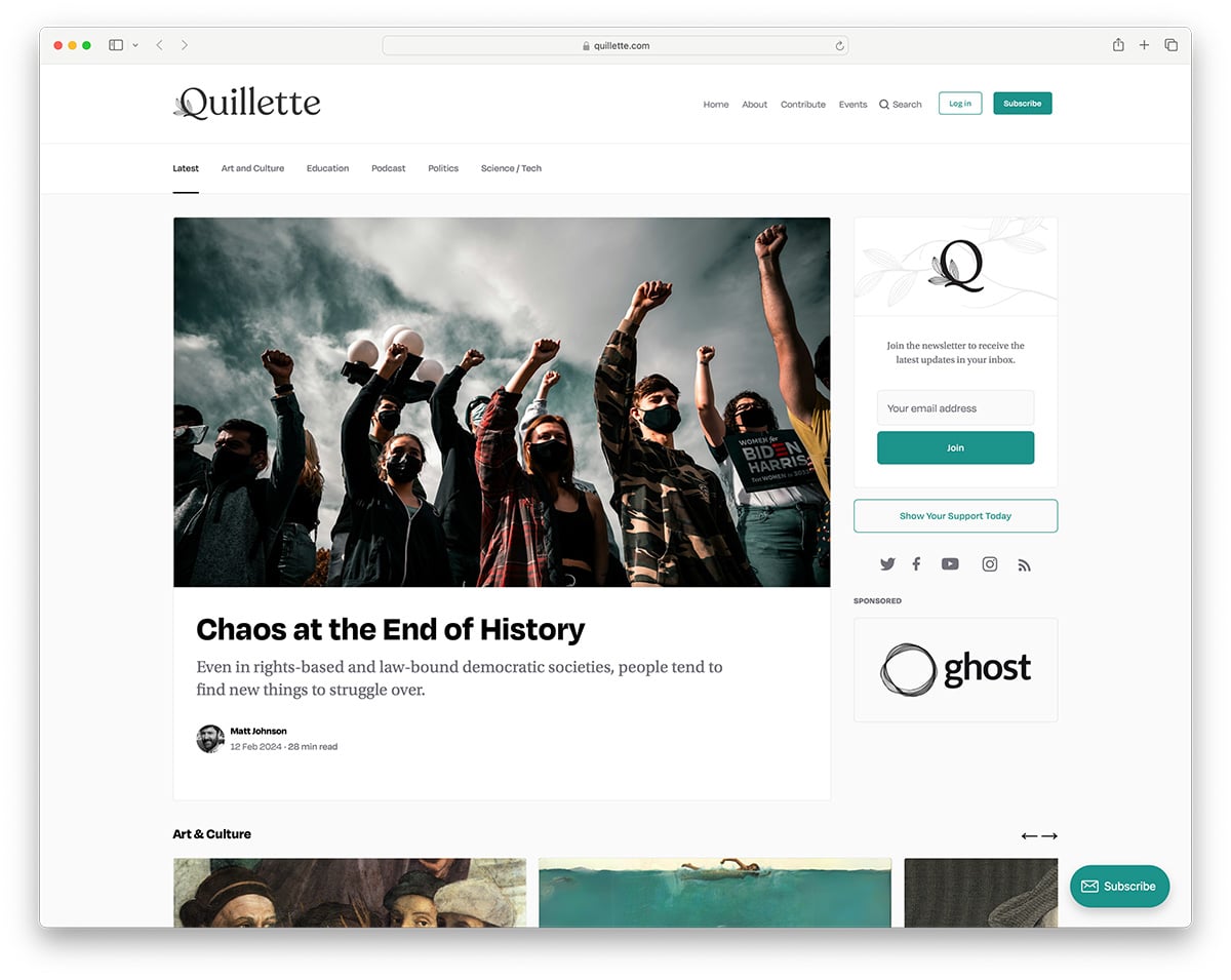 Quillette is a blog on art, culture, politics, and science. It used Ghost features such as subscriptions and podcasts and is a great example of what you can create without writing a single line of code.