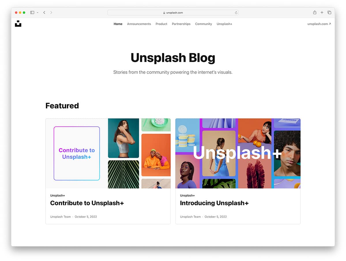 Unsplash is the most popular resource for finding images for websites, design projects, presentations, etc. It has a library of hundreds of millions of free websites. They use Ghost to announce company news, and, like their main site, the blog is image-focused and uses white space well.