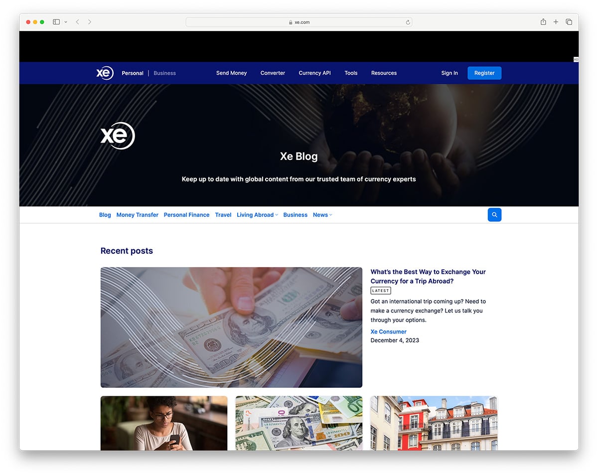 XE is a popular money transfer and exchange platform with over 30 million users worldwide, and its API is used by 300 major financial companies, including Shopify and ClearBooks. They use Ghost for their blog, focusing on company news and financial education. It features a dark color scheme that builds trust in its users.
