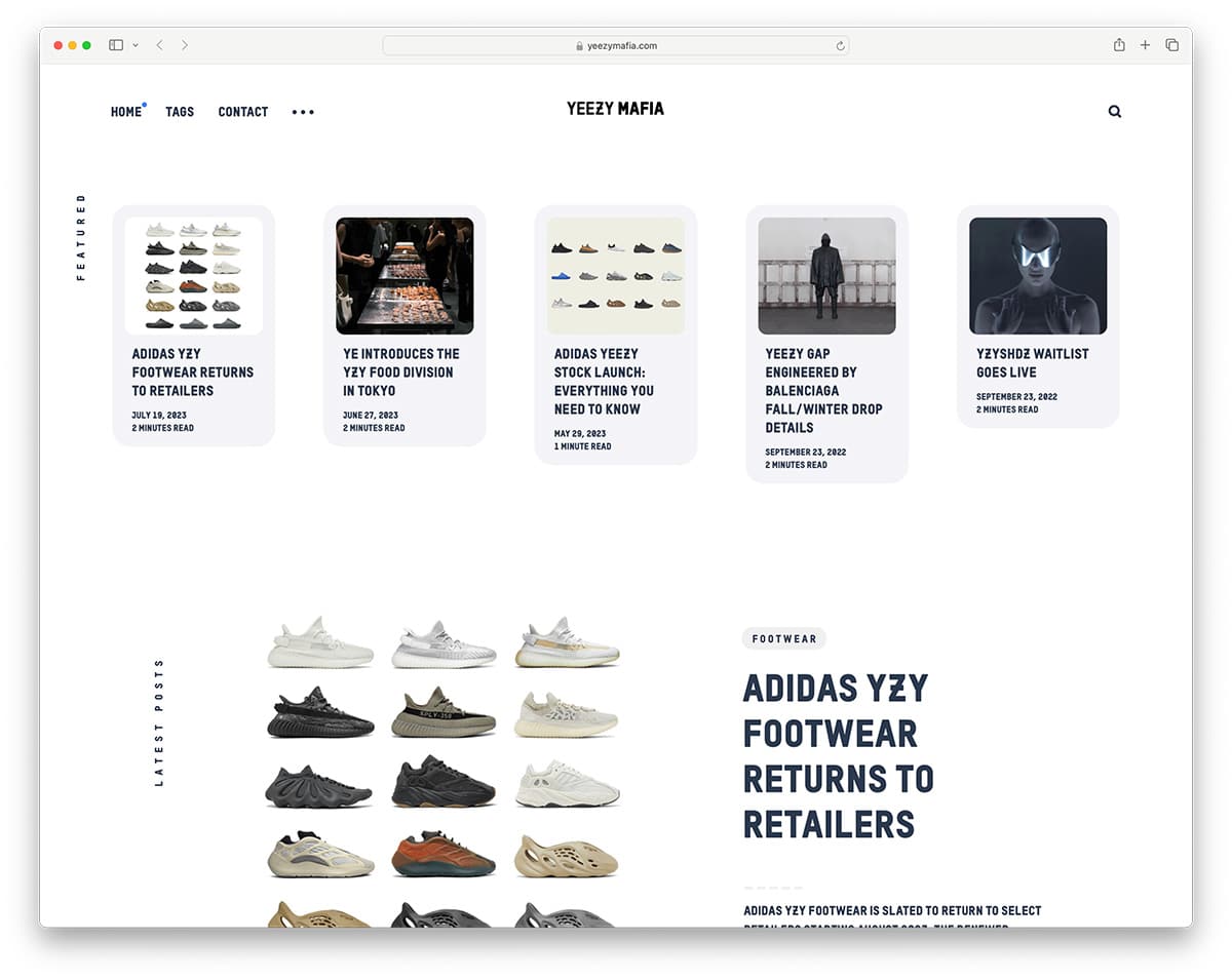 Yeezy Mafia is a popular eCommerce website that provides information about shows that used to be popular for many years before their main designer got publicly canceled. This site still exists today, but I wouldn’t be surprised if it eventually merges with another website. Meanwhile, their news section uses Ghost with a basic white theme, featuring a post section, while the rest uses a basic grid.