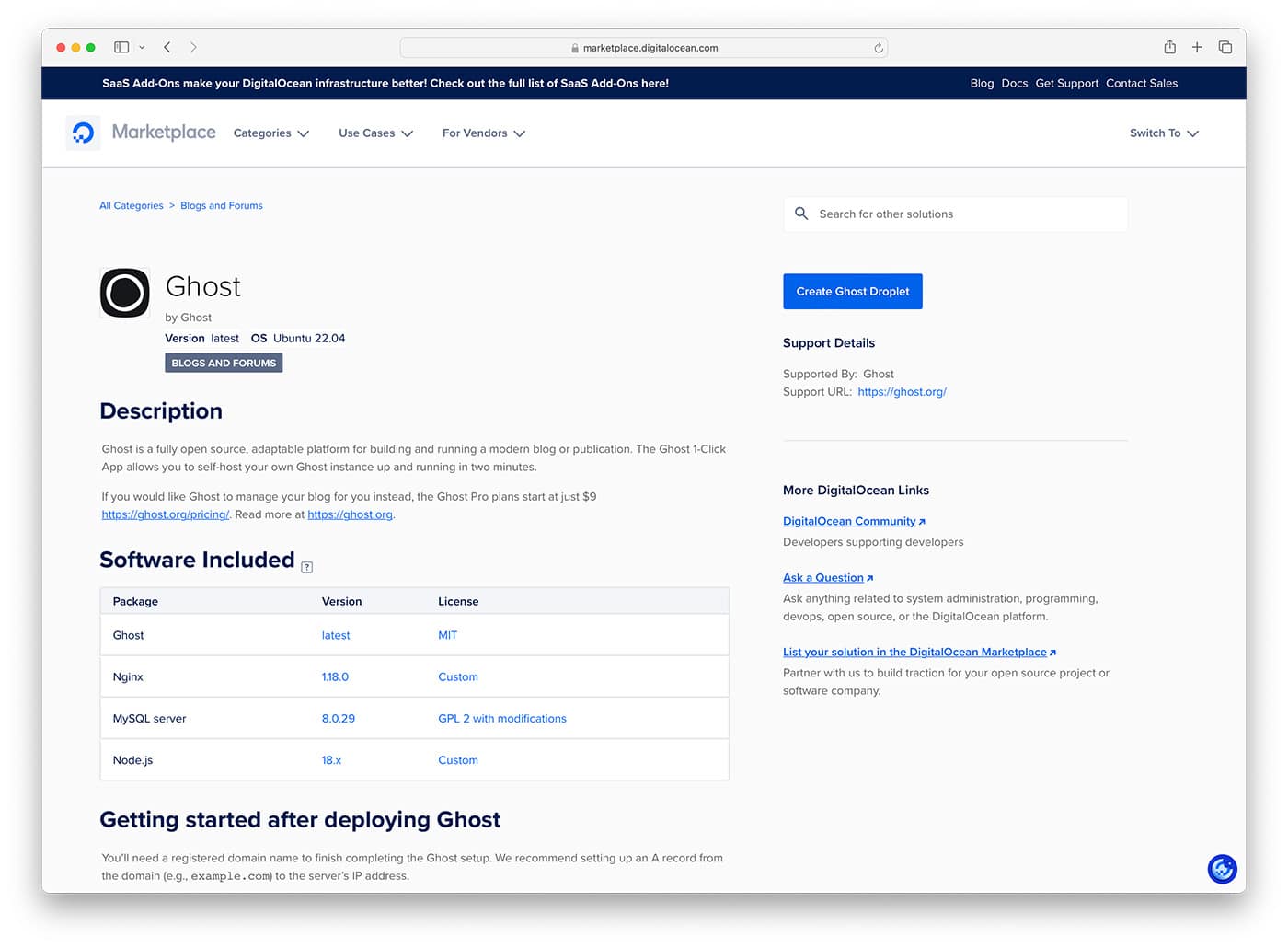 DigitalOcean offers a user-friendly, scalable, and cost-effective cloud hosting solution. Its performance-optimized droplets, straightforward interface, and comprehensive documentation make it an ideal choice for hosting Ghost CMS, especially with the 1-Click App option available in the DigitalOcean Marketplace.
